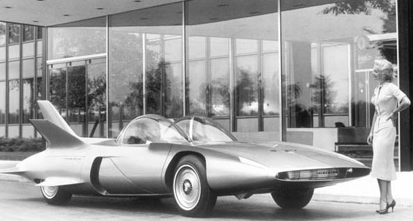 Earl’s second Firebird, designated XP-43, was intended to parlay the lessons learned with the Firebird I into a more practical four-seat family car. With its distinctive double air intakes at the front, high bubble canopy and fin, the Firebird II was intended to be a component of GM’s “Safety Autoway of Tomorrowâ€, a rapid transit system which would take advantage of an “electronic brain†in the car, which received signals from a metallic conductor buried in the road, the magnetic device creating a form of autopilot for cars. The boffins at GM worked hard to get the system working and eventually conducted successful tests of what the company dubbed the “dream highwayâ€. The Firebird II was the first car to have its entire exterior bodywork constructed from titanium, then being used in the construction of the USA’s state-of-the-art fighters such as the McDonnell F-101 Voodoo and Lockheed’s F-104 Starfighter — another of Earl’s appropriations of contemporary aeronautical techniques.