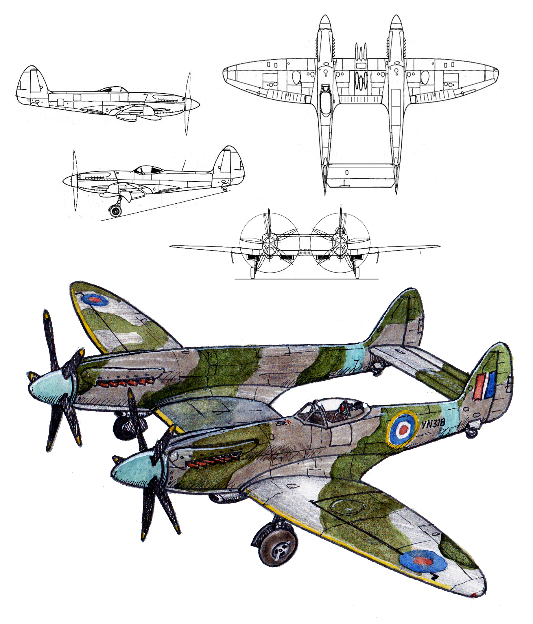 Seeking a presence for itself over Korea during the escalating conflict, the RAF deployed a squadron of Twin Spitfire FB Mk 2s to Kimpo airfield (shared with RAAF Meteors) in 1951. The spectacular range and loitering capability of the aircraft was intensely attractive for close air support purposes and though no longer competitive in pure speed terms when compared to the latest jet fighters, the Twin Spitfire could still compare fairly favourably with the F-80 Shooting Star and was expected to be able to outmaneouvre any North Korean fighters that might be encountered. As it turned out this was to be the Twin Spitfire’s moment of glory. On the 4th of August 1952, Twin Spitfires dove on two Mig-15s and destroyed them both. A fortnight later they repeated the feat and the Twin Spitfire became one of the very few piston engined types to destroy a jet fighter in air to air combat.