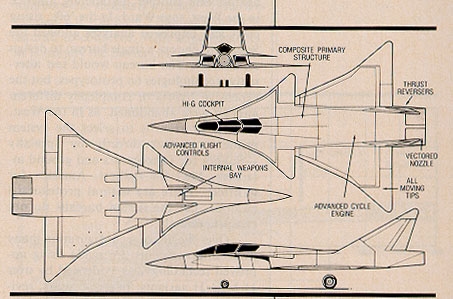 In reality, this design idea was never used (albeit to a small degree on some cruise missiles), and it could be argued that the cultivation of this idea was the result of deliberate disinformation by several companies. Loral, Northrop and Lockheed (in several ATF artworks) may have been actively involved in this attempt to draw attention away from the F-117-facetingand B-2 flying wing approach. This idea can be seen on most ‘F-19s’ and is evident on this MiG-37.