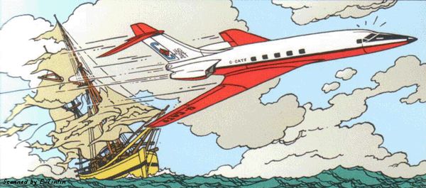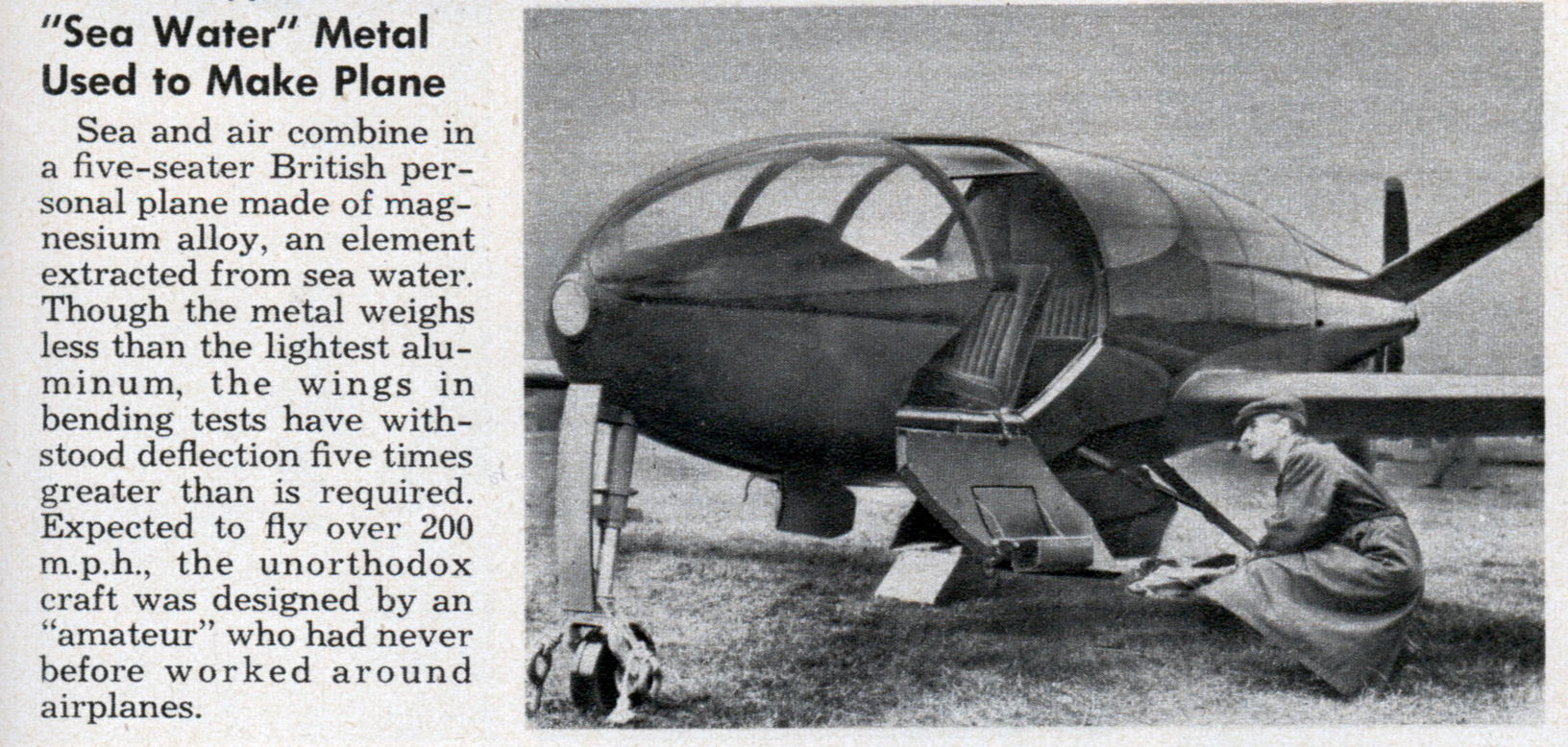 The 1948 Planet Satellite was an unusual and very beautiful aeroplane. Its appearance suggested that Hergé had created it especially for Tintin to steal. The aircraft was the shape of a tear-drop, with a butterfly ‘Y-shaped’ tail. Its ‘hygienically’ clean shape spoke of speed, progress and a utopian future. The Satellite was a revolutionary design in almost every way. It was a true monocoque design, for those unfamiliar with the term- this does not mean it was single-penised (in fact, the aircraft had no penis). A monocoque structure is supported by its external skin, as opposed to using an internal frame. It is analogous to an invertebrate (such as a beetle), whereas an animal with a normal internal skeleton, like a person, is more like a traditional aircraft. Though many aircraft are described as monocoque, strictly speaking, the vast majority are actually semi-monocoque. The Satellite was a true monocoque design, meaning it was far simpler structurally than any contemporary aircraft. This simplicity could result in an aircraft that was cheap to produce and assemble, with far less to go wrong. These traits were vital as the Satellite was intended to become a flying Model-T Ford.
