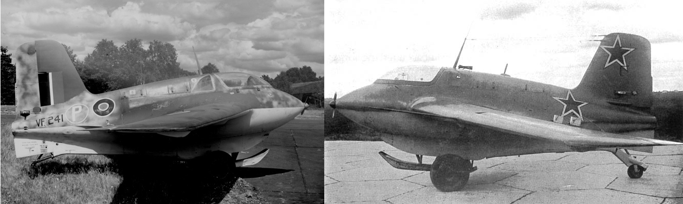 Komets were bagged in numbers by the western Allies in 1945. A further tiny handful went to the USSR. Radical in design, the Komet had a novelty factor that remains intact to this day. The fastest aircraft of the war represented a mixture of the futuristic with miserable Fascist policies. As the Third Reich met it’s end a quasi-secret array of ridiculously high potential weapon systems was revealed. Prototypes and research findings from these programs would come to be absorbed into the technical mainstream of the victorious countries and examples of the Comet are on display in Australia, Germany, the UK, and the United States so you have a reasonable chance of seeing one wherever you live. Two seized Komets also found their way to Canada and the one at the Canada Aviation and Space Museum reveals something of the social state of things in the Thousand Year Reich. During a restoration in the 1970s it was discovered that French workers had sabotaged its Walter engine and the glue holding the aircraft’s laminated wood wings together. They also drew a cartoon inside the aircraft telling us their heart’s were not in it. If war takes the fun out of something like the Komet, you know it’s bad. Post capture, in RAF colours the Komet looks kind of cuddly but strange. Soviet stars on the other hand suit the ‘power-egg’ down to the ground.