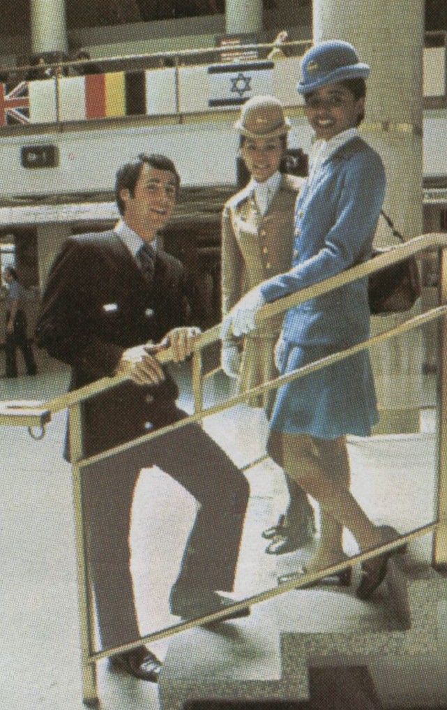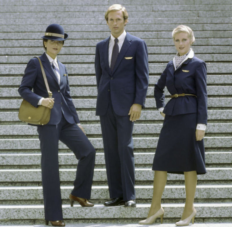 In the early 1970s, Pan Am had hired high-end designers of their own to create a new male flight attendant outfit that complemented the women’s uniforms. They were elegant, crisp, modern suits inspired by Carnaby Street fashions and even had matching umbrellas. One Pan Am steward confessed that he loved walking through airport terminals wearing the suit, because he knew every gay man watching him would be both turned on and envious when they saw him.