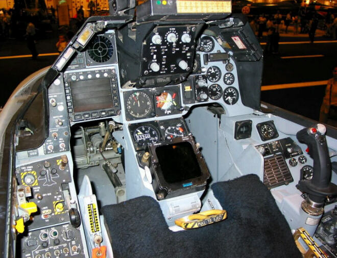 A relatively uncluttered cockpit for a multi-role fighter, can be attributed to factors such as single-engine, limited air-to-air radar in the A-model, and emphasis on the HUD, as well as good design, of course. The monochrome tactical display is low and centred, with primary flight instruments immediately above. Cockpit visibility was outstanding due to the lack of a canopy windscreen bow and high-mounted seat. The side-mounted control stick pioneered in the F-16 has become familiar on other modern fighters and some commercial aircraft.