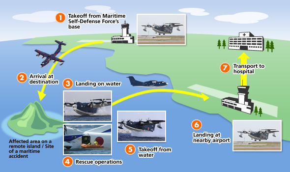 After Japan’s defeat, the Kawanishi Aircraft Company which had been responsible for Imperial Japan’s finest flying-boats and floatplanes, stopped work on manned suicide missiles and was reborn as Shin Meiwa Industries (later ShinMaywa). They built upon their legacy of superb wartime aircraft with results culminating in one of the most impressive aircraft in the world today. There is nothing like the US-2, it is the best prop-driven flying boat design ever made. This amphibian is a radical update of the 1960s US-1 introducing the best of early 21st century technology. The secret of its remarkable short take-off, which can be as small as 280 metres, is the ‘blown’ control surfaces; compressed air (from an engine developed for the Comanche stealth helicopter) blows down the control surfaces adding thrust – as well as steering the air flow from the main propellers. This dramatically reduces take-off distance and improves controllability. Controllability and flight efficiency is also enhanced by the presence of a modern fly-by-wire system. Seaworthiness needs to be impressive, and it is. Combined with features already mentioned, the well designed hull and spray suppressor (a gutter that re-routes spray) mean the aircraft is happy taking off in waters swelling with three metre waves.