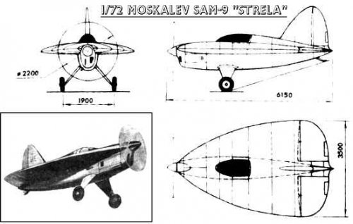 What became of this quest was something far less impressive than Moskalev had envisaged, but still sufficiently radical: the SAM-9, known as the Strela, or “arrow.†It retained the leaflike wing shape of the SAM-4 drawings, but featured a traditional taildragger landing gear taken from the SAM-5 (originally with skis, later with wheels) and replaced the wingtip fences with a single central vertical stabilizer. In place of the Hispano-Suiza 12Y, the aircraft featured a license-built Renault 4P inline engine with a paltry output of either 140hp or 270hp, depending on the source; far from the supersonic speeds that Moskalev dreamed of just three short years earlier, the SAM-9 would achieve a maximum speed of 190 mph.