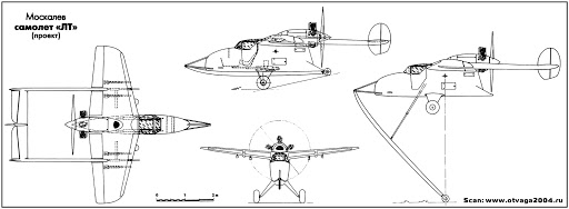 Another Moskalev design from around the same time, albeit existing only on paper, was the SAM-23 (also known as the LT) ground attack aircraft. Not to be confused with an assault glider with the same designation, this aircraft featured the twin-boom configuration of the SAM-13, again with a single vertical stabilizer intersecting the tailplane, but with only a single pusher engine, an M-11 radial of 150hp, very weak for a 1940s design. However, armed with two 20mm cannon, an equal number of 7.62mm machine guns, and up to four RS-82 air-to-ground rockets, it would’ve been quite formidable for its size.