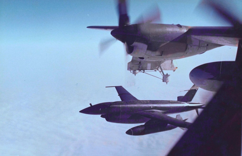 One test flight over California on Jan. 3, 1966 nearly ended in disaster when the drone sharply pitched up shortly after launch and collided with the DC-130 mothership. The collision demolished the drone and knocked the propellers off the DC-130’s number-four engine.