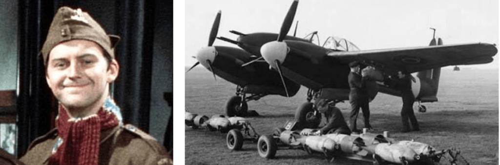 Let’s go with the Westland Wapiti (everyone’s a bloody Westland!). It was very old in World War II the Wapiti entered service in 1927 and the wings were actually lifted from the World War I DH.9 but was still operational during War World II. The actor who played Godfrey, Arnold Ridley, was wounded at the Somme (AND fought with the BEF in France in 1940) so both have WWI and WWII connections. The Wapiti is most famous for its civilian achievement of flying over Everest and Ridley was actually a very successful playwright in the ’30s, so both enjoyed civilian fame in the interwar period.
