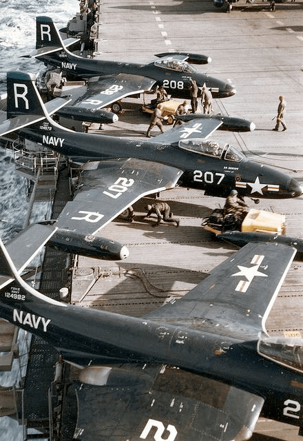 “Three F2H-2B Banshees armed with dummy Mk 7 nuclear shapes flew from USS Midway 100 miles off Guantanamo Bay, Cuba, refuelled when airborne, dropped to treetop level over Florida and flew undetected—even though the Air Force had been alerted—to a target in Lake Erie. On the return, the F-86s and F-89s trying to intercept them were baited down to 5,000 feet when the Banshees zoomed to 55,000 feet and left the Air Force interceptors spinning out as they tried to follow them to the high altitude. The Banshees refuelled over the Atlantic and landed on the Midway after a nearly 8-hour flight, a record 2,800-nautical-mile flight from and to a carrier. “