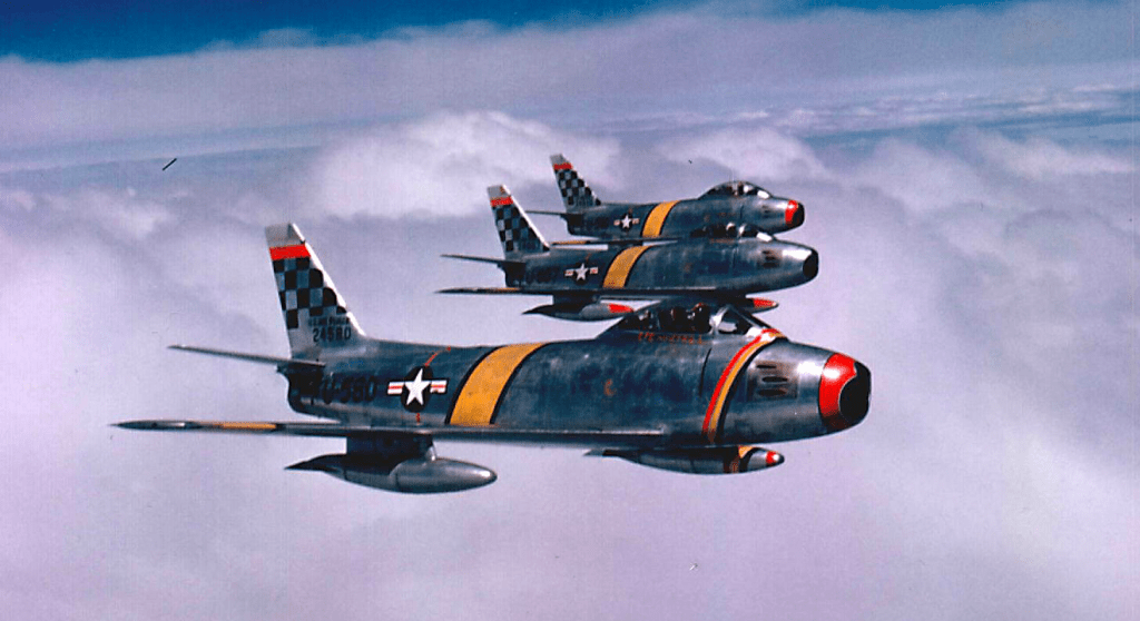 When the Korean War began in June, 1950 the small Allied air forces in South Korea relied on WW II propeller-driven aircraft and early, straight-winged F-80 and F-84 jets. None matched the Soviet MiG-15, a broadly similar swept-wing jet to the Sabre. F-86As were urgently deployed to counter this unanticipated threat. Despite the MiG-15’s altitude advantage and its pilots’ proximity to their home bases the outnumbered, but better-trained Sabre pilots soon regained air superiority. It was a scenario to be repeated in many respects in Vietnam over a decade later.