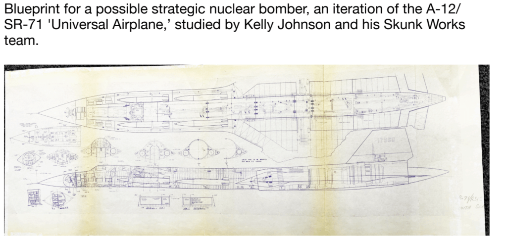 The SR-71’s potential versatility is not widely known. Clarence ‘Kelly’ Johnson, the genius designer of all ‘Blackbirds’, was diligent in assuring that the Mach 3+ Blackbird aircraft could fulfil several roles, if needed for national contingencies. The first version was the A-12 aircraft, built for the Central Intelligence Agency (CIA). This was a single-person airplane and carried as principal sensor, one very high-resolution optical camera.Â