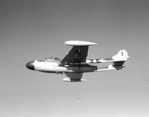 Quite how the superb Vampire transmuted into the nightmarish NF.3 is anybody’s guess, but what is clear is that as an all-weather night fighter the NF.3 was a catastrophe. Let us start with the NF.3’s single engine, which had a tendency to flame-out, stop or catch fire. As much of the aircraft was ‘fuel-soaked wood’, fires spread extremely rapidly. One would hope for a reliable fire warning system for such a risky aircraft, but this would have been unjustified optimism, as the erratic system often gave false warnings. Crew were instructed to escape the aircraft in the event of an engine fire, though no ejection seats were provided. The two crew sat cramped side-by-side with a cockpit insufficiently roomy for the new ‘bone-dome’-style helmets. Visibility was practically zero from the windshield in rain (hardly ideal for an all-weather fighter), it would mist up at high altitude, and had a tendency to crack. The A.I.21 radar, the primary sensor, suffered extremely poor serviceability. The fuel gauges lied, the electrical system was unreliable, the aircraft was exhaustingly unstable demanding constant attention, it had lower performance than the earlier far lighter NF.2, the air brakes were poor and provided no use at all below 200 knots… the catalogue of failings goes on and on. We’ll leave the final word to Flying Officer Paul Hodgson as quoted in Peter Caygill”s brilliant book, Jet Jockeys, ‘The Venom NF.3 was the most unpleasant aircraft I have ever flown, and perhaps, the least suited for its intended role.’