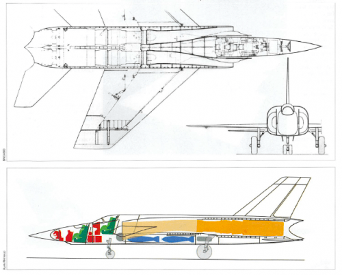 Responding to the same 1953 call-for-tender as the MD-550 ‘Mystère Delta’, the project proposed by SNCAN was more powerful, far larger, and much faster than its competitors. Nord Aviation ambitiously demanded a Mach 1.6 top speed for their design, rather than the Mach 1.3 specified in the requirement. This sexily futuristic project was known as the Nord 5000 ‘Harpon’. The Nord 5000 was a delta-canard interceptor long foreshadowing the configuration of today’s European fighters. Its design was rather extreme, with wings were fixed very far back in the fuselage while its canard foreplanes almost at the very tip of the nose. finally. It singular appearance was utterly exciting, screaming speed, potency and modernity. A single-engine prototype was to be built fitted with a 1500-kg thrust SEPR rocket engine. A second, far larger twin-engine version would have followed. The story of which engine was intended for this aircraft is a convoluted one. Across the study, between 1952 to 1956 engine technology was evolving so fast that proposed advanced engines rapidly became obsolete. The single-engine variant was initially envisaged with a RR Nene, then an Atar 9, while the twin-engine version was first schemed around the Gabizo then the Orpheus 12. After extensive studies and tests with four models, Nord requested funds to build the first prototype. Unfortunately, for the 5000, the all-conquering Mirage III was already proving perfectly suitable and there was no need for two high-speed interceptors. Nord was not going to give up without a fight however, and pestered the authorities for the budget for at least one prototype in order to explore its advanced design and structure – and to explore the possibility of Mach 2 supercruise. But the authorities stubbornly denied funds and the thrilling 5000 was lost forever.