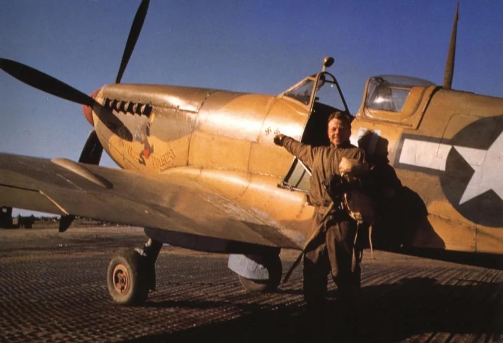 Featuring well up the charts is the plane that is obviously the greatest fighter of all time and which equipped two US fighter groups, the 31st and the 52nd, through late 1943 and 1944 in North Africa, Sicily and Italy. In the air battles following Torch, they were involved in probably the last battle when the Luftwaffe was still at its peak, with Focke Wulf Fw190s, Me109Gs and a host of great aces like Muncheberg, Bar, Reinert and Rudorffer. The new American groups did well, the 135-victory Muncheberg was lost in a collision with a US Spitfire, and several aces were created in the Med campaign before the groups switched to Mustangs in mid-1944.