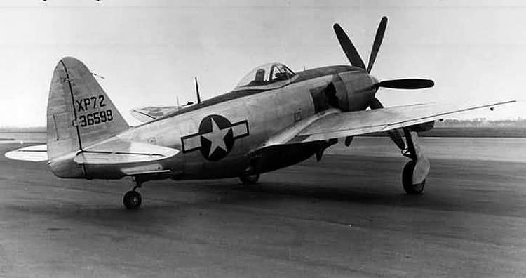 Two prototypes were built, flying in February and June 1944 respectively. As completed the XP-72 was roughly the same size and weight as the P-47D but possessed about 50% greater power and was more aerodynamic, the resulting performance was fantastic, a 490mph top speed was recorded and developed versions of the R-4360 were expected to give production P-72s a speed of 540mph (an optimistic figure but indicates the uncharted realms of performance the P-72 was expected to be operating in).