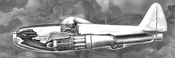 Initially the General Electric J31 engine, a centrifugal flow turbojet based on the British Whittle W.2B was considered but even the portly Thunderbolt’s fuselage was not sufficiently large to satisfactorily accomodate this large diameter engine. Further development centred on the Allison J35, America’s first axial flow turbojet, which was slimmer. Removing the R-2800 piston engine freed up space in the nose for the jet intake and the proposed armament of six or eight 50 calibre machine guns giving a more concentrated firepower than the wing mounted guns of the standard Thunderbolt. The jet engine was mounted below the cockpit floor, necessitating a slightly deepened fuselage with the jetpipe taking up the space previously filled by the large turbosupercharger and its extensive associated ducting, which were obviously no longer required.