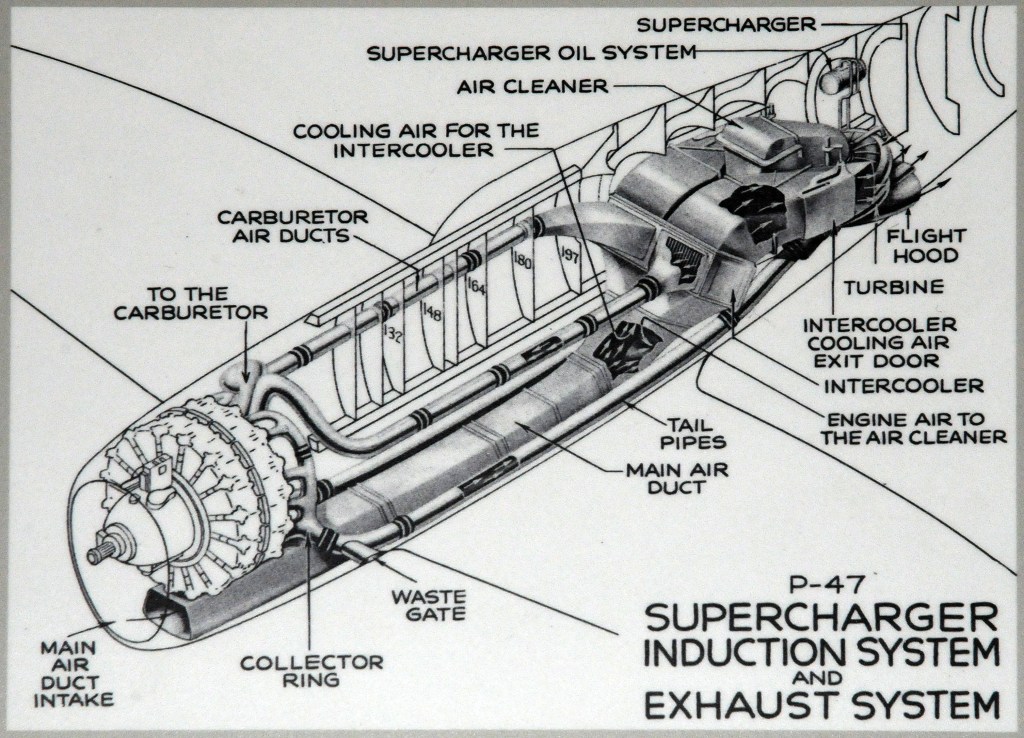 The Thunderbolt prototype, the XP-47B flew for the first time in May 1941. Despite superficially resembling the P-43, it was some 65% heavier and fitted with a Pratt & Whitney R-2800 Double Wasp rated at 2000hp, as also utilised by both the Vought F4U Corsair and Grumman F6F Hellcat. The XP-47B was lost in August 1942 by which time the first production P-47Bs were coming off the line. Unlike the turbosupercharger installation in the P-43, which was almost an afterthought, Kartveli set about designing the ideal installation for this equipment in the new fighter. Accepting that it was best located in the rear fuselage (some 22ft (6.7m) away from the engine) a complicated system of ducting took exhaust gases back to the turbine whilst cooling air was directed to the intercooler and further ducts brought compressed air forward to the carburettor. Despite its complexity, it performed reliably in service and proved surprisingly resilient to battle damage.