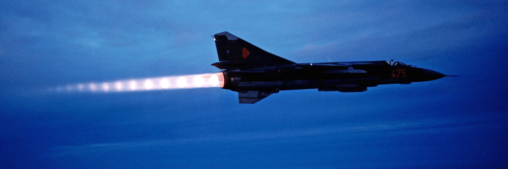The MiG-23’s maximum Mach number stated in most sources is 2.35. And that’s correct, for reasons of temperature (cockpit canopy “silvering”) and directional static stability, the MiG-23 is indeed limited to Mach 2.35. But that’s not its true limit. According to the MiG-23M and MiG-23ML flight manuals, the maximum attainable Mach at high altitude is 2.55 or 2.6, and that’s not even clean…that’s when carrying two R-23 missiles!