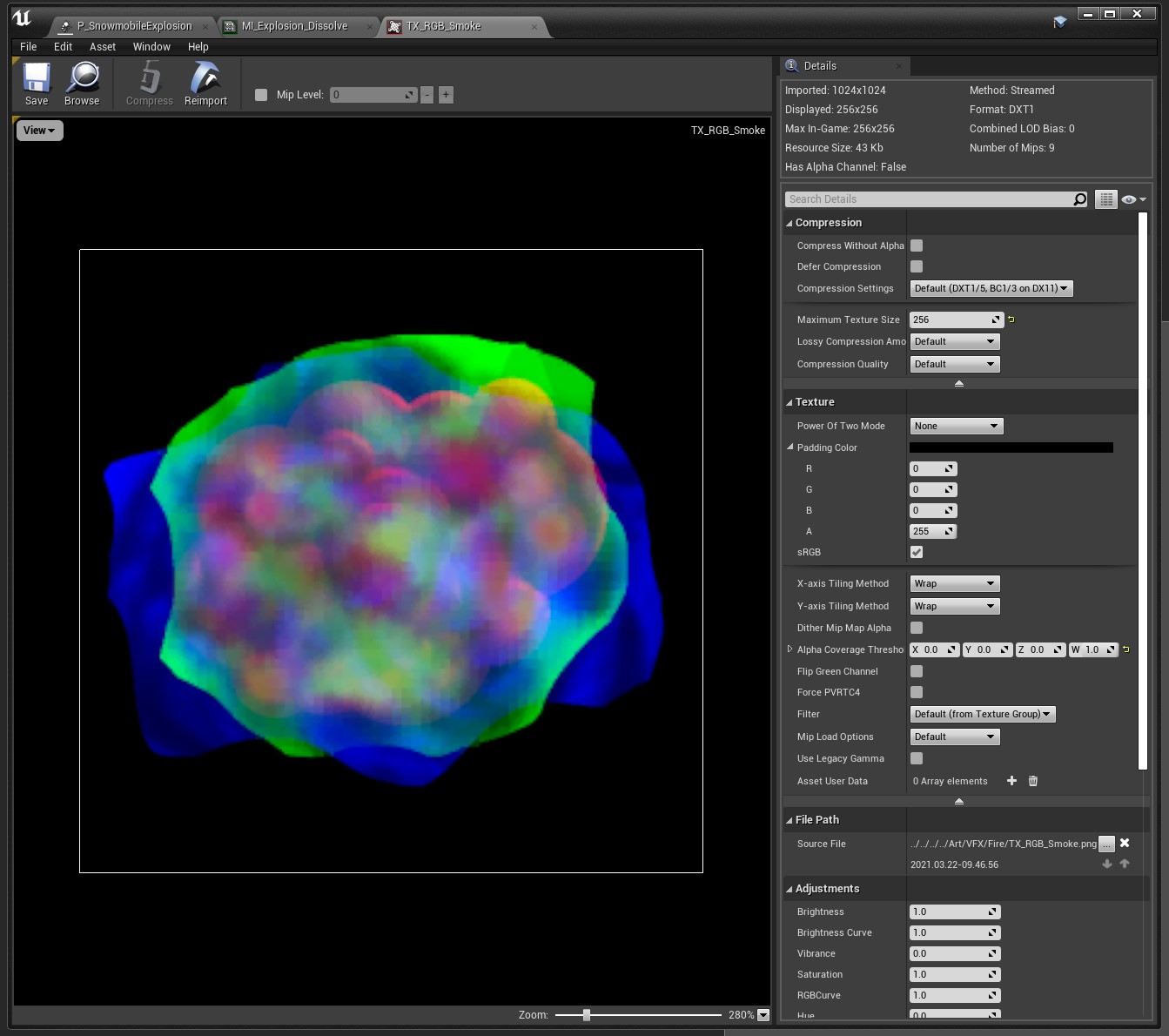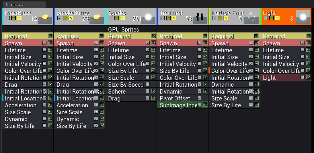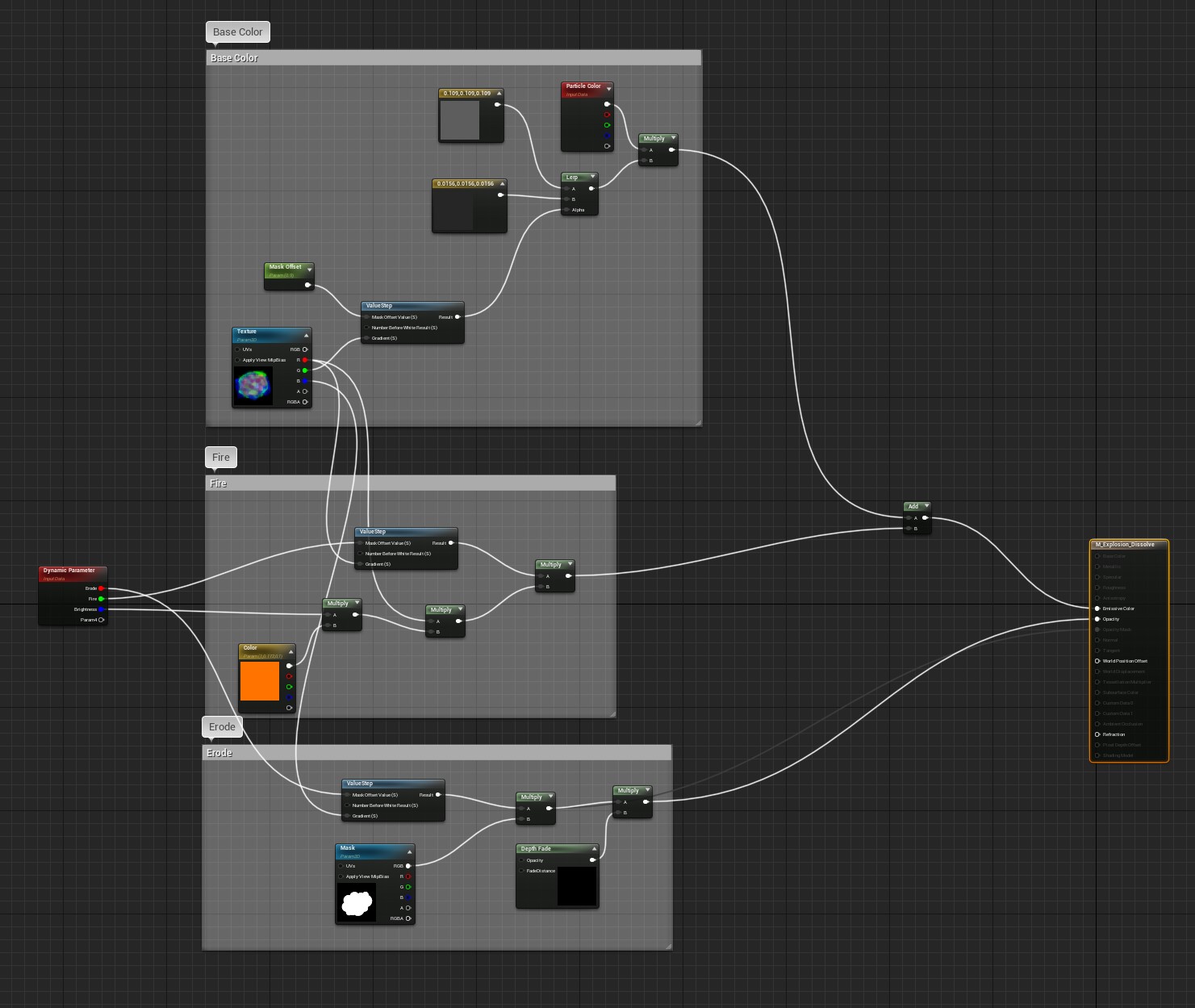 A stylised explosion effect in Unreal’s Cascade particle system. I used a custom texture pack with each channel used to drive a different part of the inner blast. In the shader I used erosion of the R channel to dissolve the effect over time, and similar to control the temperature.