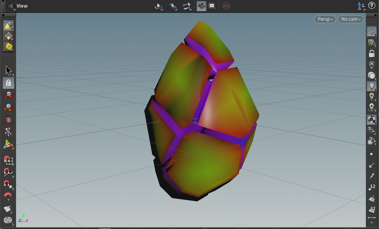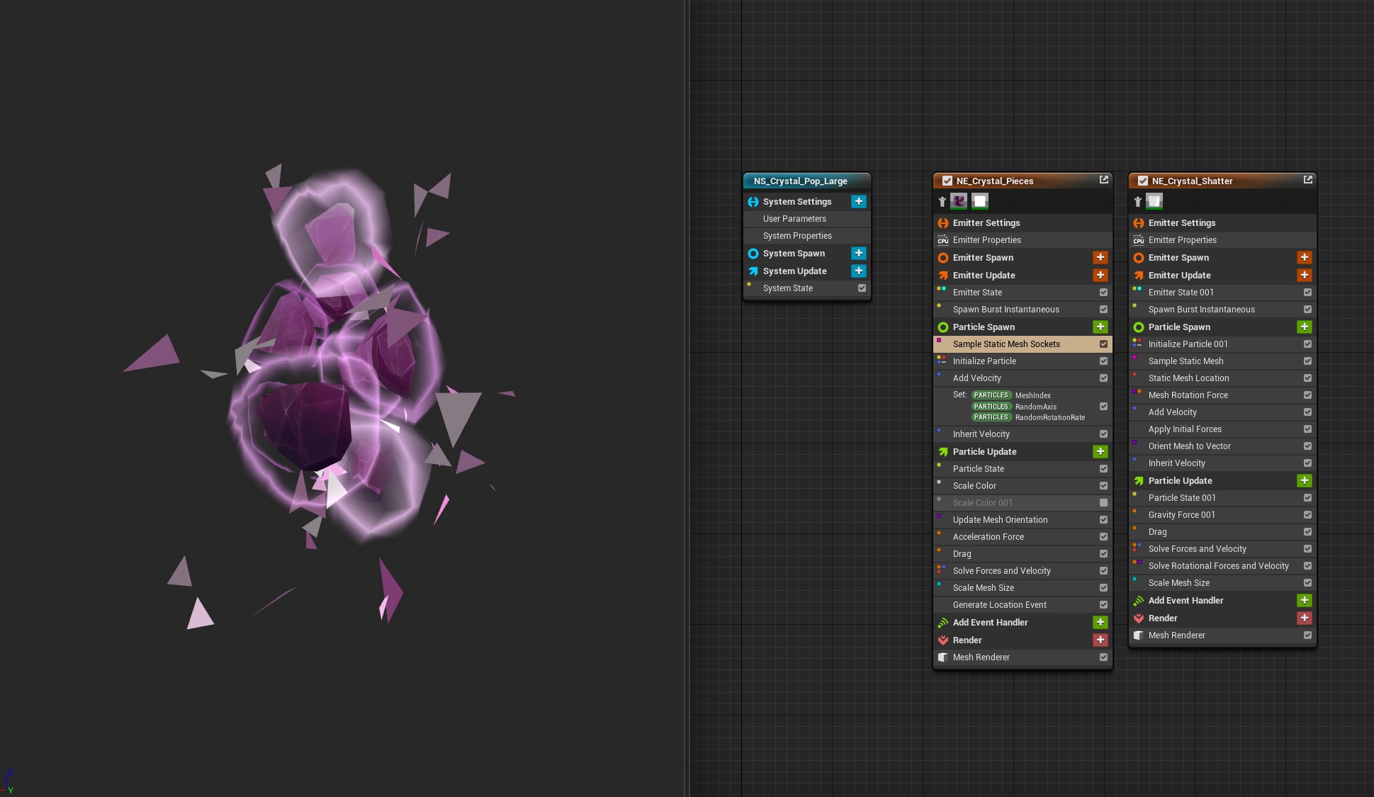 For this effect I needed the crystal to pop and crumble away in the player’s hand. I used a voronoi fracture on the original crystal mesh asset and brought the pieces into Niagara. I used mesh sockets to position the pieces accurately.